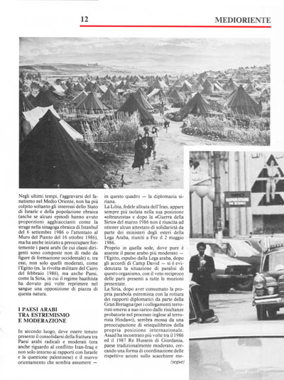 In sintesi, avevamo visto nel 1985 il crearsi di un asse preferenziale tra OLP, Egitto e Giordania, sfociato nell'accordo tra Arafat ed Hussein dell'l 1 febbraio di quell'anno (partecipazione di una delegazione congiunta giordanopalestinese alla convocanda Conferenza Internazionale di pace nel Medio Oriente; creazione di uno Stato palestinese federato con la Giordania in Cisgiordania e a Ghaza; riconoscimento israeliano dell'OLP come interlocutore legittimo nelle trattative); avevamo notato l'atteggiamento negativo di Israele e degli USA di-fronte a tali prospettive, e la contrapposizione ad esse di trattative bilaterali tra Israele e Paesi arabi, e tuttalpiù con una delegazione dei Palestinesi residenti nei territori occupati, purchè non appartenenti o designati dall'OLP; avevamo constatato come l'atteggiamento «trattativista» di Arafat avesse consolidato la spaccatura all'interno del campo palestinese (già nata nel 1983 con la rivolta di Abu Moussa), determinando il sorgere di un Fronte di Salvezza nazionale composto da tutte le fazioni palestinesi filo-siriane. Come cornice, avevamo infine accennato alla frattura esistente all'interno del mondo arabo tra paesi moderati (in primis, l'Egitto, traditore di Camp David; ma anche Giordania, Marocco, Arabia Saudita ed Algeria) e paesi radicali (Siria, Libia ed Iraq).