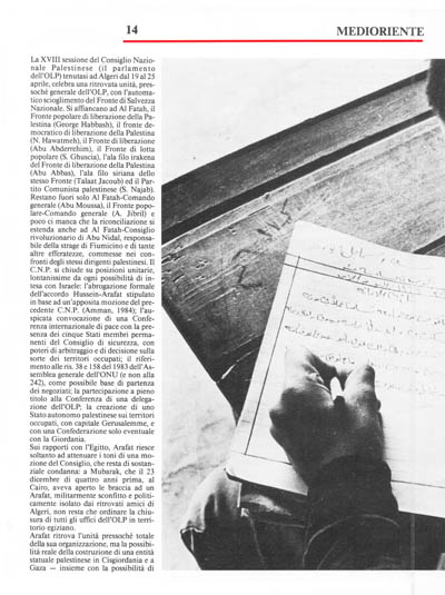 La XVIII sessione del Consiglio Nazionale Palestinese (il parlamento dell'OLP) tenutasi ad Algeri dal 19 al 25 aprile, celebra una ritrovata unità, pressoché generale dell'OLP, con l'automatico scioglimento del Fronte di Salvezza Nazionale. Si affiancano ad Al Fatah, il Fronte popolare di liberazione della Palestina (George Habbash), il fronte democratico di liberazione della Palestina (N. Hawatmeh), il Fronte di liberazione (Abu Abderrehim}, il Fronte di lotta popolare (S. Ghuscia), l'ala filo irakena del Fronte di liberazione della Palestina (Abu Abbas), l'ala filo siriana dello stesso Fronte (Talaat Jacoub) ed il Partito Comunista palestinese (S. Najab). Restano fuori solo Al Fatah-Comando generale (Abu Moussa), il Fronte popolare-Comando generale (A. Jibril) e poco ci manca che la riconciliazione si estenda anche ad Al Fatah-Consiglio rivoluzionario di Abu Nidal, responsabile della strage di Fiumicino e di tante altre efferatezze, commesse nei confronti degli stessi dirigenti palestinesi. Il C.N.P. si chiude su posizioni unitarie, lontanissime da ogni possibilità di intesa con Israele: l'abrogazione formale dell'accordo .Hussein-Arafat stipulato in base ad un'apposita mozione del precedente C.N.P. (Amman, 1984); l'auspicata convocazione di una Conferenza internazionale di pace con la presenza dei cinque Stati membri permanenti del Consiglio di sicurezza, con poteri di arbitraggio e di decisione sulla sorte dei territori occupati; il riferimento alle ris. 38 e 158 del 1983 dell'Assemblea generale dell'ONU (e non alla 242), come possibile base di partenza dei negoziati; la partecipazione a pieno titolo alla Conferenza di una delegazione dell'OLP; la creazione di uno Stato autonomo palestinese sui territori occupati, con capitale Gerusalemme, e con una Confederazione solo eventuale con la Giordania.