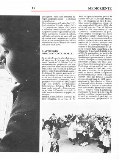 In realtà, le posizioni non sembrano del tutto omogenee, nel governo di Tel Aviv, tra il partito laburista, guidato da Shimon Perez, ed il Likud di I. Shamir, che – in omaggio ad un patto di «staffetta» non scritto di due anni prima – si sono avvicendati il 1O ottobre 1986 alla guida del governo. Perez si dichiara favorevole alla convocazione di una Conferenza internazionale di pace, come semplice cornice (priva di poteri arbitrali) per trattative bilaterali con gli . Stati arabi e in particolare con una delegazione giordano-palestinese, con rappresentanti dei territori occupati non affiliati all'OLP (ma ogni sondaggio rivela che le posizioni dominanti nei territori occupati dalla Cisgiordania e di Ghaza sono di assolutà fedeltà alla linea dell'OLP); quanto al merito, sostiene la possibilità di un ritiro di Israele dai territori occupati per consentire la formazione di una organizzazione palestinese fortemente collegata allo Stato giordano. Shamir è invece contrario ad ogni Conferenza internazionale di pace, pur se priva di poteri arbitrali, per evitare che essa si trasformi in un processo arabo ad Israele davanti all'opinione pubblica mondiale, e rifiuta comunque ulteriori ritiri dai territori occupati dopo quello del Sinai del 1982, prevedendo per la Cisgiordania e per Ghaza – dove negli ultimi due anni è in sensibile aumento la difficoltà di convivenza fra le due comunità palestinese ed israeliana – semplici forme di autonomia municipale. Per la ventà, la diversità di opinioni in politica estera rimane all'interno di un ventaglio di posizioni comunque lontano da ogni possibilità di intesa con l'OLP. Tuttavia, il timore di Shamir che Perez – nella sua veste attuale di Ministro degli Esteri – si esponesse a dichiarazioni troppo liberali nei confronti delle aspirazioni palestinesi, ha dato vita a gravi frizioni interne e ad episodi per certi aspetti grotteschi: come quando Perez, in procinto di recarsi negli USA per perorare le proprie posizioni, ha bloccato, in qualità appunto di Ministro degli Esteri, l'inoltro, tramite l'ambasciata israeliana di Washington, di un telex di Shamir con il quale si avvertiva la Casa Bianca che l'ex premier in arrivo avrebbe parlato a titolo personale; con la conseguenza che il Primo ministro ha spedito identico messaggio con la posta ordinaria.