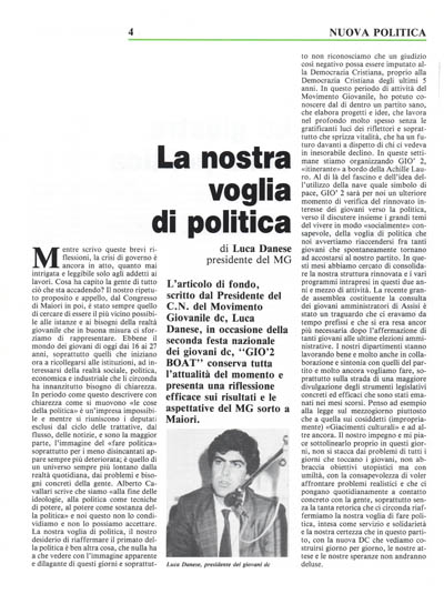 In queste settimane stiamo organizzando GIO' 2, «itinerante» a bordo della Achille Lauro. Al di là del fascino e dell'idea dell'utilizzo della nave quale simbolo di pace, GIO' 2 sarà per noi un ulteriore momento di verifica del rinnovato interesse dei giovani verso la politica, verso il discutere insieme i grandi temi del vivere in modo «socialmente» consapevole, della voglia di politica che noi avvertiamo riaccendersi fra tanti giovani che spontaneamente tornano ad accostarsi al nostro partito. In questi mesi abbiamo cercato di consolidare la nostra struttura rinnovata e i vari programmi intrapresi in questi due anni e mezzo di attività.