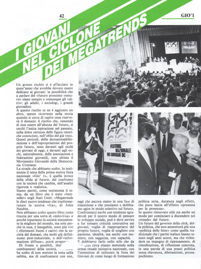 Siamo partiti, come testimonia il tenia, da un libro che è stato «bestseller» negli Stati Uniti: «Megatrends le dieci nuove tendenze che trasformeranno la nostra vita», di John Naisbitt.