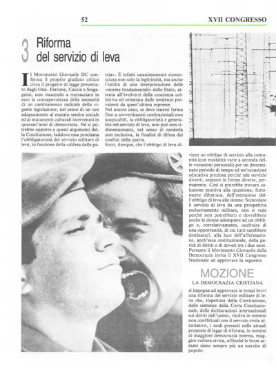 Ecco, dunque, che l'obbligo di leva diviene un obbligo di servizio alla comunità (con modalità varie a seconda delle vocazioni personali) per un determinato periodo di tempo ed un'occasione educativa preziosa perché tale servizio diventi, seppure in forme diverse, permanente. Così si potrebbe trovare soluzione positiva alla questione, fortemente dibattuta, dell'estensione dell'obbligo di leva alle donne.·Svincolato il servizio di leva da una prospettiva esclusivamente militare, non si vede perché non potrebbero e dovrebbero anche le donne adempiere ad un obbligo e, correlativamente, usufruire di una opportunità, di cui tutti sarebbero destinatari, alla luce dell'affermazione, anch'essa costituzionale, della parità di diritti e di doveri tra i due sessi. Pertanto il Movimento Giovanile della Democrazia invita il XVII Congresso Nazionale ad approvare la seguente