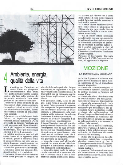 È da notare con soddisfazione, in definitiva, un importante passaggio culturale, al quale del resto la DC sta lavorando da tempo: l'ecologia non è più una proprietà di pochi tecnici, non è più l'oggetto di catastrofismi misantropici, non è più un'ecologia emotiva e priva di contenuti.