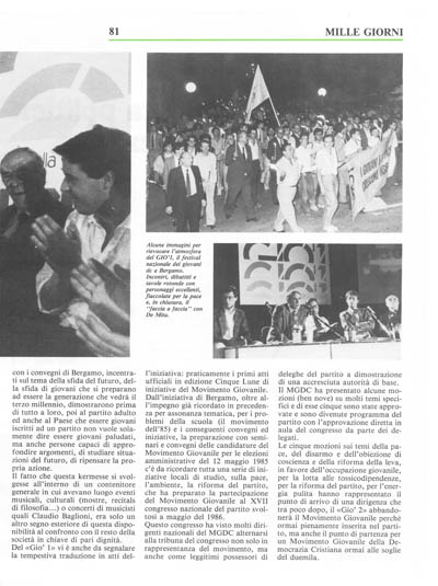 In un clima di forte entusiasmo la prima festa nazionale dei giovani dc di Bergamo monopolizzò l'attenzione dei principali mezzi di informazione del Paese con il suo mosaico di interventi politici, culturali e spettacolari. I giornali si stupirono nello scoprire che le cose dette dai nuovi giovani dc erano vere: non esistevano più giovani dcmarziani ma c'erano sempre giovani uguali a tanti altri che avevano fatto una scelta di impegno politico e non per questo si ritenevano né più bravi né più vicini alla "Verità". I giovani dc con i convegni di Bergamo, incentrati sul tema della sfida del futuro, della sfida di giovani che si preparano ad essere la generazione che vedrà il terzo millennio, dimostrarono prima di tutto a loro, poi al partito adulto ed anche al Paese che essere giovani iscritti ad un partito non vuole solamente dire essere giovani paludati, ma anche persone capaci di approfondire argomenti, di studiare situazioni del futuro, di ripensare la propria azione.
