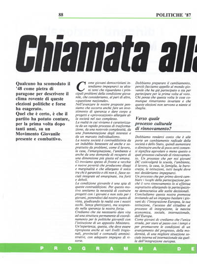 Dobbiamo renderci conto che è alle porte un cambiamento radicale della società e dello Stato, quindi aumentare o diminuire anche di poco certi consensi significa agevolare o meno questo o quel processo culturale di rinnovamento. Un processo che per noi giovani DC coinvolgerà la scuola, l'ambiente, il lavoro, la casa, la famiglia, la burocrazia, le istituzioni, tutti luoghi dove noi desideriamo impegnarci.