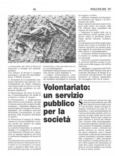 Sono moltissimi i giovani che oggi dedicano gratuitamente parte del loro tempo al servizio della società e del prossimo. Questo rilevante fenomeno, conosciuto col nome di «volontariato», è nato prevalentemente all'interno del mondo cattolico ed ha conosciuto in questi ultimi anni un notevole sviluppo. Diversi sono i campi sui quali spaziano le attività del volontariato: recupero delle tossicodipendenze, assistenza materiale e morale ad anziani, portatori di handicap, emarginati, animazione sociale e culturale per giovani, detenuti, ecc. Servizi, questi, che spesso riempiono vuoti e carenze istituzionali. Come giovani democratici cristiani intendiamo, nel pieno rispetto delle competenze e delle autonomie, farci portavoce a livello politico dei valori e delle esigenze del volontariato, al quale deve essere riconosciuta la funzione di «servizio pubblico» per il bene di tutta la nostra società.