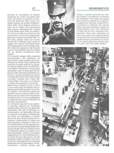 4. il dibattito sugli esiti di un auspicato processo negoziale sta finalmente uscendo dalle necessarie ma generiche indicazioni della sola Conferenza Internazionale e sta riportando alla luce la necessità di soluzioni differenziate per Gaza, la Cisgiordania e Gerusalemme est. Sono in molti quelli che affermano l'impossibilità di creare uno Stato palestinese spezzato in due territori (Cisgiordania e Gaza appunto) sulla scorta del vecchio progetto delle Nazioni Unite del 1947 per evidenti motivi di difficoltà logistica ed anche di impatto psicologico, mentre si fa strada il suggerimento di «internazionalizzare» la striscia di Gaza (alla quale si ricordi nemmeno l'Egitto di Sadat teneva più di tanto) e di prospettare una soluzione palestinese per la Cisgiordania. Su Gerusalemme, «capitale eterna» per Israele, e capitale spirituale per altre due religioni, il problema è certamente più complesso. Non credo che quanto detto autorizzi a pensare che l'equazione palestinese è del tipo «impossibile»; sicuramente le soluzioni sono ancora molte, ma cresce di giorno in giorno la consapevolezza (una volta affermata in mala fede da tutti, comunità internazionale, Stati arabi, palestinese ed ebrei ma smentita nei comportamenti) che lo stallo non è più economicamente e politicamente conveniente per nessuno. Le ragioni della forza devono cedere il passo alla forza della ragione.