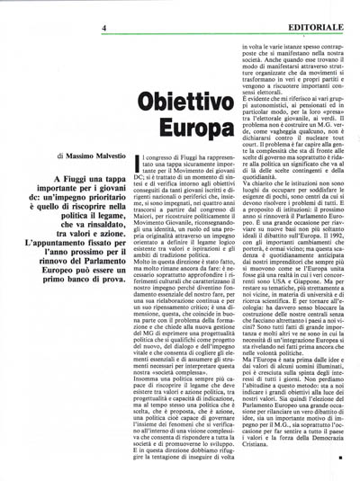 Ma l'Europa è nata prima dalle idee e dai valori di alcuni uomini illuminati, poi è cresciuta sulla spinta degli interessi di tutti i giorni. Non perdiamo l'abitudine a questo metodo: sta a noi indicare i grandi obiettivi alla luce dei nostri valori. Sia quindi l'elezione del Parlamento Europeo una grande occasione per rilanciare un vero dibattito di idee, sia un importante motivo di impegno per il M.G., sia soprattutto l'occasione per far sentire a tutto il paese i valori e la forza della Democrazia Cristiana.