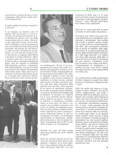 È un esempio, un maestro, non c'è dubbio. Dai suoi discorsi si ricava veramente un esempio illuminatore ai fini dell'attività politica oltre che della comprensione del suo valore. Devo dire che, negli ultimi tempi, nel suo desiderio di impegno c'era la percezione di una crisi morale profonda nella società nazionale, che emerge nei suoi discorsi, nelle sue frasi, ricordate poi sui manifesti: «se non nascerà un nuovo senso del dovere, la stagione della libertà e dei diritti si rivelerà effimera». Moro si rendeva conto che c'era una crisi di ordirte morale e spirituale profonda nel paese; non più soltanto il problema dell'emergenza ·politica, economica; dell'ordine pubblico, ma una crisi delle convinzioni e dei costumi nel profondo della nostra gente. Dieci anni fa la situazione era ancora meno grave di oggi. C'era già stato tuttavia il referendum sul divorzio come sintomo gi questo cambiamento. Perciò, il suo insegnamento deve essere visto come un richiamo alle ispirazioni cristiane, ai valori morali di fondo, indispensabili per la stessa convivenza politica. Per quanto riguarda il partito, in ciò c'era giù un appello a una forma di reazione al cedimento di ordine morale, presente nella società e di riflesso anche nei partiti, sulla base della concezione della politica come servizio, come esercizio di un dovere di ispirazione cristiana. Non credo ci possano essere indicazioni concrete sul modo di fronteggiare gli avvenimenti di attualità nei rapporti fra le forze politiche perché naturalmente, dopo la sua morte, la situazione politica si è modificata. Probabilmente, se fosse stato vivo Moro, i comunisti non avrebbero interrotto così presto la politica di solidarietà nazionale e le cose sarebbero andate diversamente. Quindi non credo si possano ricavare indicazioni minute, se non l'orientamento di fondo, di consolidare ulteriormente la democrazia, rendendola partecipata a tutto il popolo italiano, conservando per la DC la funzione di guida e di orientamento.
