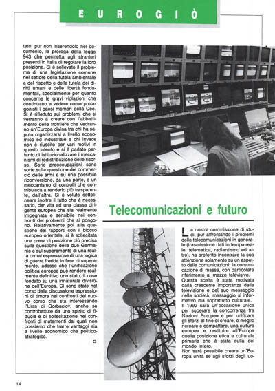 La nostra commissione di stu- di, pur affrontando i problemi delle telecomunicazioni in generale (trasmissione dati in tempo reale, telematica, radiantismo ed altro), ha preferito incentrare la sua attenzione solamente su un aspetto delle comunicazioni: la comunicazione di massa, con particolare riferimento al mezzo televisivo. Questa scelta è stata motivata dalla crescente importanza della televisione e del suo messaggio nella società, messaggio sì informativo ma soprattutto culturale. Il 1992 sarà un'occasione unica per superare la concorrenza tra Nazioni Europee e per unificare gli sforzi al fine di creare, o meglio ricreare e compattare, una cultura europea e restituire all'Europa quella posizione etica e culturale primaria che è stata culla del mondo intero.
