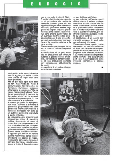 La televisione, oltre al sempre più concentrato potere di pressione politica riconosciuto ai mezzi di comunicazione, propone senza alcun controllo e sempre più spesso, con l'unico obiettivo di perseguire fini economici, produzioni di dubbio valore culturale e sociale. È appunto per tentare di frenare questa incontrollata corsa che noi chiediamo un codice di regolamentazione per quanto riguarda il servizio televisivo, regolamentazione a livello di Comunità europea e non solo di singoli Stati. È inutile infatti limitare un certo tipo di produzione alla emittente nazionale quando, grazie allo sviluppo tecnologico delle telecomunicazioni, possiamo essere raggiunti da segnali televisivi provenienti da altre nazioni, i cui contenuti sono proprio quelli vietati da un eventuale nostro codice di regolamentazione: è utile invece fissare dei «principi guida» che favoriscano la crescita culturale e la pace sociale.