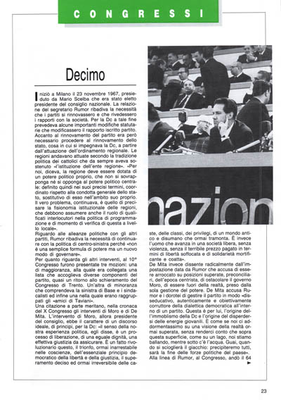 Una citazione a parte meritano, nella cronaca del X Congresso gli interventi di Moro e di De Mita. L'intervento di Moro, allora presidente del consiglio, ebbe il carattere di un discorso ideale, di principi, per la Dc: «il senso della nostra esperienza politica, egli disse, è un processo di liberazione, di una egua]e dignità, una effettiva giustizia da assicurare. E un fatto rivoluzionario questo, il trionfo, ormai inarrestabile nelle coscienze, dell'essenziale principio democratico della libertà e della giustizia, il superamento deciso ed ormai irreversibile delle caste, delle classi, dei privilegi, di un mondo antico e disumano che ormai tramonta. È invece l'uomo che avanza in una società libera, senza violenza, senza il terribile prezzo pagato in termini di libertà soffocata e di solidarietà mortificante e coatta».
