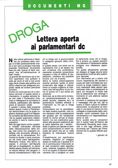 Non da oggi siamo contro qualsiasi rimedio individuato nell'area della «liberalizzazione» della droga, così come non possiamo accettare che strumento efficace e corretto sia la carcerazione. Entrambe le strade ci pare conducano nel vicolo cieco dell'egoismo. Riteniamo invece, che fermo restando il principio dell'illeceità dell'uso di stupefacenti, lo sforzo debba essere diretto ad individuare misure efficaci che tengano in dovuta considerazione il fatto che chi si droga non è accomunabile in categorie giovanili della criminalità.