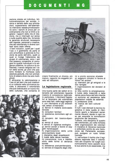 I giovani Dc prendono atto che il fenomeno del volontariato ha ormai assunto, nella esperienza sociale una dimensione tale da rendere anacronistica la realtà del nostro sistema giuridico che, mentre in numerose leggi nazionali e regionali fa esplicito riferimento all'attività del volontariato, talora indicandone i meccanismi di raccordo con le istituzioni pubbliche, ancora lo affida nella sua struttura di fondo e nelle sue necessarie tutele alle alternative ed ai rischi della interpretazione giurisprudenziale. La realtà etica (con la mobilitazione di una moralità sommersa}, economica (con l'apporto, secondo una indagine dell'Eurisco, di 15 mila miliardi), imprenditoriale (con la promozione di iniziative che favoriscono l'occupazione), organizzativa (con l'esistenza di 10 mila gruppi) del volontariato, impone rispetto e considerazione da parte delle istituzioni.