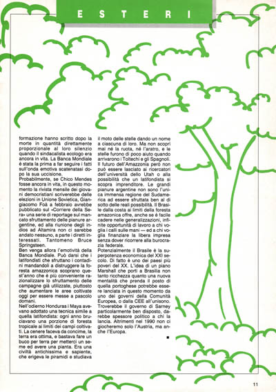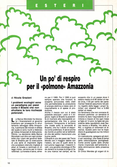 La Banca Mondiale ha bloccato i finanziamenti al governo brasiliano per proseguire lo sfruttamento selvaggio della Amazzonia, il polmone del mondo in difesa del quale si sono riuniti a febbraio gli indios minacciati di distruzione. Ottimo. La decisione della Banca Mondiale vuol dire con ogni probabilità che i piani del governo federale di Brasilia per la costruzione di una serie di imponenti dighe che avrebbero distrutto migliaia di ettari di foresta e centinaia di villaggi indios, verranno per lo meno rallentati. La foresta è salva, almeno per il 1989. Per il 1990 si può sempre sperare che funzioni la scoperta annunciata nello Utah che permetterebbe la produzione di energia elettrica a tasso zero di inquinamento e di spese di produzione.