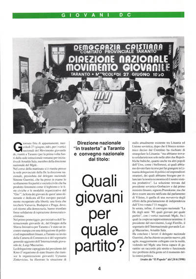 Giornata fitta di appuntamenti, mercoledì 27 (giugno, ndr), per i vertici nazionali del Movimento giovanile dc, riuniti a Taranto (per la prima volta fuori dalla sede istituzionale romana) per iniziativa di Arnaldo Sala, membro della direzione nazionale del Mgdc.