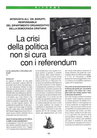 Io distinguerei l'esito del voto rispetto alla riforma elettorale perché tra i due fatti è un punto d'arrivo. Il 6, 7 maggio e il 3, 4 giugno hanno dimostrato una notevole disaffezione verso i partiti e il sistema politico in generale. L'aumento degli astenuti, delle schede bianche e nulle, le leghe al nord e le liste civiche al sud, dicono che c'è l'esigenza di riannodare un filo che si è sfilacciato. Credo anche che il problema delle leghe non sia un fatto localistico e la Dc sbaglia a considerarlo tale, perché nasce sì da episodi localistici, ma tende a mostrare una disaffezione e una sfida verso i partiti tale da diventare un problema nazionale. Se la lega fosse un fatto lombardo sarebbe troppo bello. C'è il rischio che tale modello sia esportabile (in parte lo è stato) e che diventi un modello nazionale. La riforma elettorale non serve a risolvere questi problemi (ad esempio in Lombardia lo sbarramento non fermerebbe la lega). Credo però in uno sbarramento del 5% che costringa i partiti minori agli apparentamenti, per avere una visione della politica, attraverso la scheda elettorale, più gradevole e presentabile. Detto ciò, affermo che neppure il 5%, né l'elevazione a 20.000 abitanti del sistema maggioritario, risolve il distacco tra la pubblica opinione e i partiti che la interpretano.
