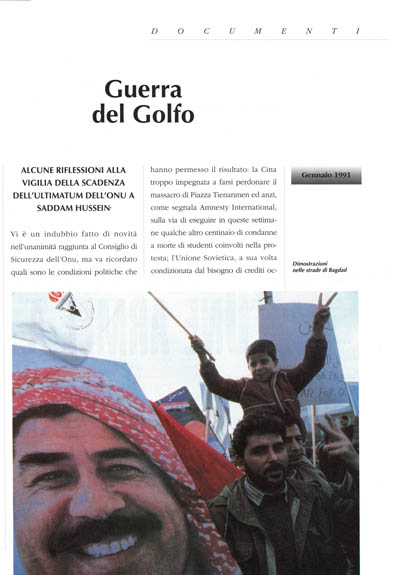 1. Una sottolineatura di alcuni fattori già assodati: la responsabilità irachena dell'aggressione del Kuwait, le atrocità commesse nei primi mesi dell'invasione delle truppe irachene; il livello, la varietà degli sforzi diplomatici compiuti prima del 15 gennaio che non hanno precedenti in nessun conflitto del passato dopoguerra; la divisione del mondo arabo che non sembra riconoscere in Saddam Hussein il leader della nazione araba; le difficoltà della diplomazia occidentale tradizionale nei confronti di un islamismo che vede nella jihad islamica la coronazione più alta del proprio scontro con il Nord del mondo; la volontà irachena – ricorrente nel tempo, fin dagli anni '60 – di impossessarsi di uno Stato mai riconosciuto politicamente fin dalle origini.