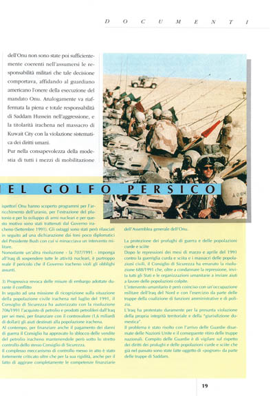 Dalla prospettiva opposta, va segnalata la tergiversazione eccessiva dell'Europa e dell'Italia che, accettata la prospettiva politica dell'intervento coattivo dell'Onu non sono state poi sufficientemente coerenti nell'assumersi le responsabilità militari che tale decisione comportava, affidando al guardiano americano l'onere della esecuzione del mandato Onu. Analogamente va riaffermata la piena e totale responsabilità di Saddam Hussein nell'aggressione, e la titolarità irachena nel massacro di Kuwait City con la violazione sistematica dei diritti umani.