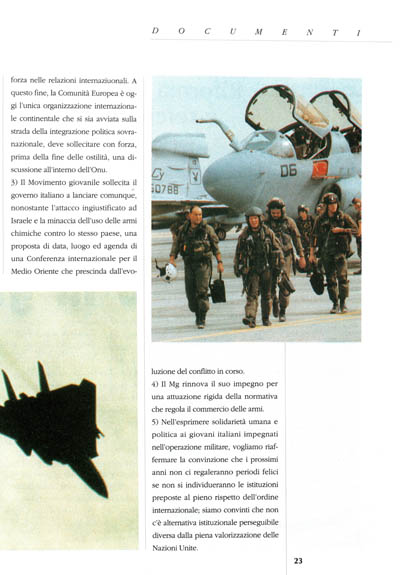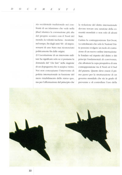 5. Nell'esprimere solidarietà umana e politica ai giovani italiani impegnati nell'operazione militare, vogliamo riaffermare la convinzione che i prossimi anni non ci regaleranno periodi felici se non si individueranno le istituzioni preposte al pieno rispetto dell'ordine internazionale; siamo convinti che non c'è alternativa istituzionale perseguibile diversa dalla piena valorizzazione delle Nazioni Unite.