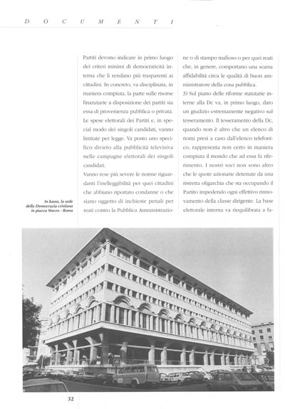 1) È necessario, infatti, far seguire all'autoriforma del Partito una riforma delle Istituzioni e della legge elettorale che ricrei effettivamente l'equazione consenso, potere, responsabilità; ogni autoriforma della Dc, che non sia seguita a breve termine da tali modifiche, si rivelerebbe effimera o nella migliore delle ipotesi di scarsa incisività.