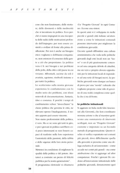 «Se leggete attentamente le liste presentate dai partiti per questa consultazione elettorale, vi accogerete di una presenza molto significativa di giovani candidati per la Democrazia Cristiana. Questa nuova presenza ci richiede di spiegare il senso, le difficoltà e l'importanza dell'esperienza che in tanti stiamo facendo. Siamo consapevoli delle cose che non funzionano, delle storture, delle disonestà e delle mediocrità che si incontrano in politica. Ecco perchè ci siamo impegnati in una riscoperta delle radici delle motivazioni profonde dell'impegno: per non essere costretti a crollare di fronte alla prima disillusione. Per noi è anche un bisogno etico: vogliamo e dobbiamo conquistare, non estorcere il consenso della gente a ciò che proponiamo. La politica vera è lì: nei bisogni e nei problemi della polis, della città o del paese in cui viviamo. Affrontarli, uscirne da soli è avarizia, egoismo; risolverli insieme e per tutti è la politica.
