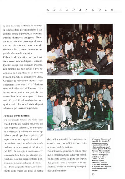 L'alleanza democratica non potrà nascere come somma dei partiti esistenti. Quattro zoppi, pur correndo insieme, non faranno mai Carl Lewis. E poi: Segni non può aspettare di convincere Forlani, Martelli di convincere Craxi, Occhetto di convincere Ingrao. I vecchi partiti sono morti. E' un'illusione tentare di riformarli dall'interno. L'alleanza democratica non può che nascere allora da un nuovo patto tra i settori più credibili del vecchio sistema e quei settori della società civile disposti a lavorare per una nuova politica".