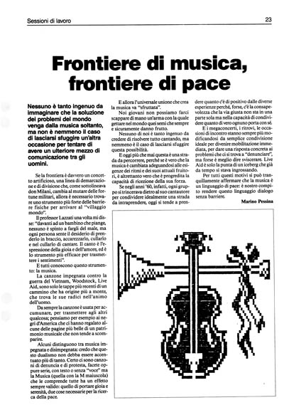 Alcuni distinguono tra musica impegnata e disimpegnata: credo che questo dualismo non debba essere accentuato più di tanto. Certo ci sono canzoni di denuncia e di protesta, facete oppure serie, con testo o senza "voce'' ma la Musica (quella con la M maiuscola) che le comprende tutte ha un effetto sempre valido: quello di portare gioia e serenità, due cose necessarie per la ricerca della pace.