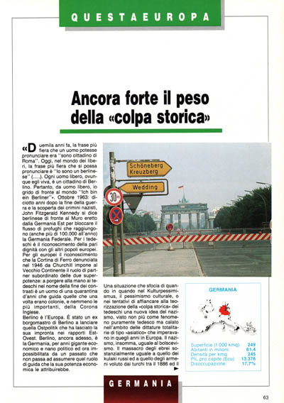 Pochi mesi dopo il presidente della Repubblica Federale di Germania, Richard Von Weiszaecker, si reca, primo nella storia, in visita ufficiale in Israele. C'è poco gelo, ma molto imbarazzo. Il passato pesa ancora, e su Weiszaecker pesa il passato del padre, accusato a suo tempo di atteggiamenti tiepidi nei confronti del Fuehrer. A Berlino, dove è morto lo scorso anno Rudolf Hess, l'ultimo gerarca nazista, i sovietici stanno demolendo il carcere di Spandau, dove Hess aveva trascorso gli ultimi 40 anni di vita. A poca distanza sorge ancora il Muro, che con il passare del tempo sa sempre di più di un monumento alla sconfitta della Germania.