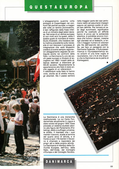 Tra la Germania Federale (paese tra i sei fondatori della CEE) e la Norvegia sta, non solo geograficamente, la Danimarca. Già membro dell'EFTA, l'organizzazione internazionale a carattere economico voluta dal Regno Unito negli anni '50 per creare un contraltare alle nascenti Comunità Europee (CECA ed Euratom), la Danimarca è al pari dell'Olanda uno di quei paesi che ancora adesso mantengono all'interno della CEE un rapporto privilegiato con Londra. Perché le loro economie ancora adesso sono legate a doppio filo a quella britannica. Quando, nel 1983 la signora Thatcher rischiava di far saltare i delicati equilibri dell'integrazione europea facendo levare a gran voce le richieste di una parte della stampa italiana di una serie di misure più che dimostrative nei suoi confronti, la risposta dei più avveduti fu che una Comunità senza il Regno Unito sarebbe stata, oltre che senza senso, anche senza Olanda e Danimarca. Inoltre sarebbe stato impossibile sperare in una richiesta d'ammissione da parte dei paesi scandinavi, una volta consumato il divorzio.