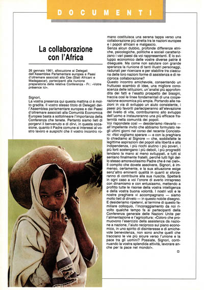 La vostra presenza qui questa mattina ci è molto gradita. Il vostro stesso titolo di Delegati del- 1'Assemblea parlamentare europea e dei Paesi d'oltremare associati alla Comunità Economica Europea basta a sottolineare l'importanza della Conferenza che tenete. Pertanto siamo lieti di porgervi il benvenuto e di dirvi, in questa occasione, quanto il Padre comune si interessi al vostro lavoro e auspichi che il vostro incontro romano costituisca una serena tappa verso una collaborazione più stretta tra le nazioni europee e i popoli africani e malgascio.