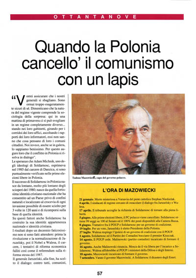 Nessun dirigente comunista eletto al primo turno, solo pochi quelli ripescati al secondo; con l'8% della popolazione iscritta al Partito Comunista, il Poup ha conseguito, in termini proporzionali, il 5% dei voti. Solidamosc, nel giugno 89, ha fatto cappotto: 99 seggi su 100 al Senato, la stragrande maggioranza di quel 35% riservato alla libera competizione. Poi, nella seconda parte dell'estate, il 2 a O definitivo ai danni del vecchio regime: Walesa rende impossibili le condizioni per un governo diverso da quello di coalizione, ma boccia la candidatura cuscinetto di Malinowski del Partito Contadino; propone Tadeus Mazowiecki ottenendo il disco verde prima da Mosca, poi da Varsavia.