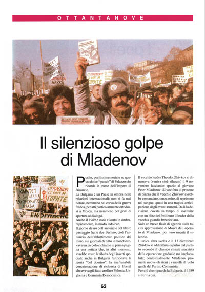 Il giorno stesso dell'annuncio del libero passaggio fra le due Berlino, cioè l'annuncio dell'abbattimento politico del muro, sui giornali di tutto il mondo trovava un piccolo richiamo in prima pagina una notizia 'che, in altri momenti, avrebbe avuto la ribalta degli inserti speciali: anche in Bulgaria funzionava la teoria "del domino", la irrefrenabile concatenazione di richiesta di libertà che aveva già fatto crollare Polonia, Ungheria e Germania Democratica.