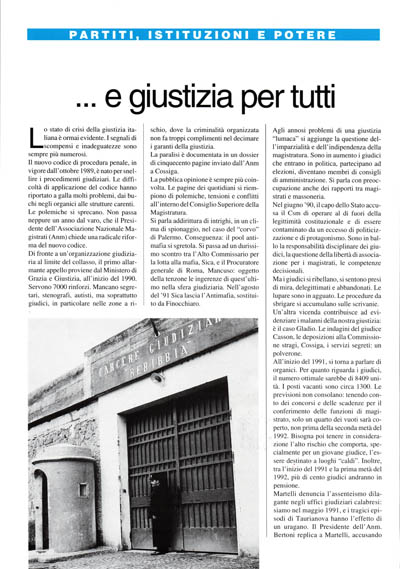 Il guardasigilli Martelli rilancia la proposta di riforma dei Pubblici Ministeri. Ma le proposte di riforma non bastano, se non vedono un'applicazione tempestiva, a curare le piaghe della giustizia. E' con questa motivazione di fondo che Raffaele Bertoni, alla fine del giugno '91, si dimette da Presidente dell'Associazione Nazionale Magistrati. Le profonde spaccature tra i giudici fanno naufragare numerosi tentativi di nominare il successore di Bertoni. Lo stesso problema si pone per la sostituzione, nel mese di luglio, di Ettore Gallo alla presidenza della Corte Costituzionale. Attriti tra magistrati, conflitti tra candidature di partito o di corrente, trattative tra segreterie politiche: la situazione dell'apparato giudiziario è di-evidente stallo. Se questa è l'indipendenza e l'autonomia di costituzionale memoria...