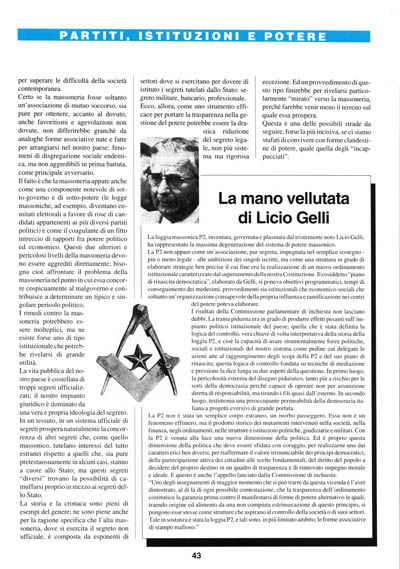 Pur avendo radici storiche antichissime (tutti abbiamo studiato le società segrete sui libri di storia), la massoneria rimane per molti aspetti un oggetto misterioso. In prima approssimazione potremmo definirla come una struttura di potere occulto che riunisce uomini della finanza, degli apparati statali, dei mezzi di informazione, del potere economico e politico con 1'obiettivo di scambiarsi reciprocamente favori di vario genere fino a costituire una sorta di sottopotere clandestino.