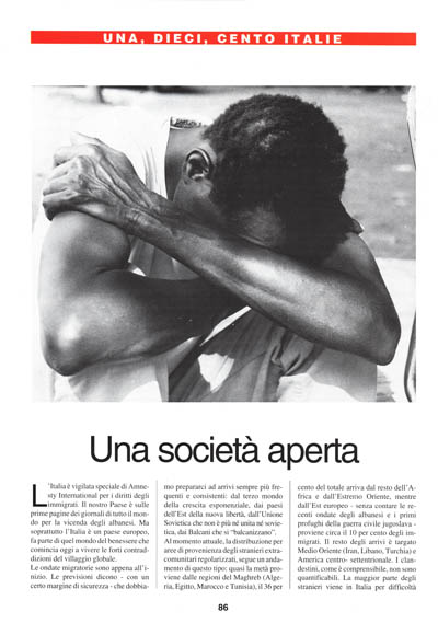 L'Italia è vigilata speciale di Amnesty International per i diritti degli immigrati. Il nostro Paese è sulle prime pagine dei giornali di tutto il mondo per la vicenda degli albanesi. Ma soprattutto l'Italia è un paese europeo, fa parte di quel mondo del benessere che comincia oggi a vivere le forti contraddizioni del villaggio globale.