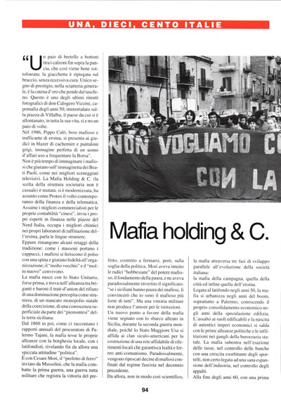 Non è più tempo di immaginare i mafiosi che giurano sull'immaginetta dei Beati Paoli, come nei migliori sceneggiati televisivi. La Mafia Holding & C. (la scelta della struttura societaria non è casuale) è mutata, si è modernizzata, ha assunto come Proteo il volto contemporaneo della finanza e della telematica. Assume i migliori commercialisti per le proprie contabilità "cinesi", invia i propri esperti in finanza nelle piazze del Nord Italia, occupa i migliori chimici nei propri laboratori di raffinazione dell'eroina, parla le lingue straniere.