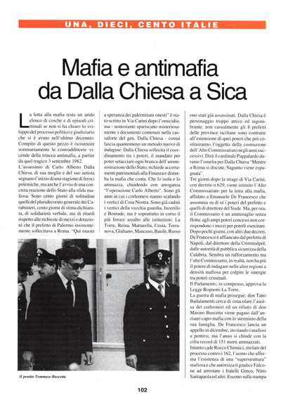 La lotta alla mafia resta un arido elenco di cosche e di episodi criminali se non si ha chiaro lo sviluppo del processo politico e giudiziario che si è avuto nell'ultimo decennio. Compito di questo pezzo è ricostruire sommariamente le contraddittorie vicende della trincea antimafia, a partire da quel tragico 3 settembre 1982. L'assassinio di Carlo Alberto Dalla Chiesa, di sua moglie e del suo autista segnano l'inizio di una stagione di feroci polemiche, ma anche l'avvio di una concreta reazione dello Stato alla sfida mafiosa. Sono cento giorni di solitudine quelli del pluridecorato generale dei Carabinieri, cento giorni di stima dichiarata, di solidarietà verbale, ma di ritardi rispetto alle richieste di mezzi e dotazioni che il prefetto di Palermo insistentemente sollecitava a Roma. "Qui muore la speranza dei palermitani onesti" è stato scritto in Via Carini dopo l'omicidio, ma – nonostante spariscano misteriosamente i documenti contenuti nella cassaforte del gen. Dalla Chiesa – costui lascia quantomeno un metodo nuovo di indagine: Dalla Chiesa sollecita il coordinamento tra i poteri, il mandato per poter setacciare ogni branca dell'amministrazione dello Stato, richiede accertamenti patrimoniali alla Finanza e disturba la mafia che conta. Che lo isola e lo ammazza, chiudendo con arroganza "l'operazione Carlo Alberto". Sono gli anni in cui i corleonesi stanno scalando i vertici di Cosa Nostra. Sono già caduti i vertici della vecchia guardia, Inzerillo e Bontade, ma è soprattutto in corso il più feroce assalto alle istituzioni: La Torre, Reina, Mattarella, Costa, Terranova, Giuliano, Mancuso, Basile, Russo ono stati già assassinati. Dalla Chiesa è personaggio troppo attivo ed ingombrante: non casualmente gli 8 prefetti delle province siciliane sono contrarie all'estensione di quei poteri che poi costituiranno l'oggetto della costruzione dell'Alto Commissariato negli anni successivi. Dirà il cardinale Pappalardo durante l'omelia per Dalla Chiesa "Mentre a Roma si discute, Sagunto viene espugnata".