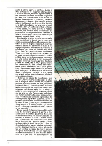 Questa delle strutture tecniche è stata anche essa una delle carte vincenti che hanno consolidato il successo della festa di Bergamo, perché i video, le schepe di presentazione, le interviste filmate a coloro che per motivi di lavoro o per impegni improwisi non ebbero la possibilità di partecipare (è il caso del Ministro degli Affari Esteri Giulio Andreotti e del fisico statunitense Teller), sono state utilizzate non come «feticcio» né come elemento di spettacolarizzazione della politica, bensì come strumentazione necessaria per una politica completa e non contingente. Uno stile rinnovato di ricerca per tutto il sistema politico dei partiti, che in futuro probabilmente non ammetterà più una «politica delle feste» come quella tradizionale che i partiti politici italiani hanno tenuto negli anni scorsi, ma richiederà un impegno di ripensamento, di rimeditazione, di riflessione concreta... in una parola, una prassi politica senza sbavature, dilettantismi, pressapochismo.