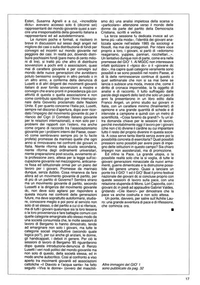 Ed infine la Pace. La grande utopia, o la possibile realtà solo che la si voglia, di tutte le giovani generazioni minacciate da nuovi armamenti, guerre dimenticate e la distruzione possibile del genere umano. Quasi a lanciare un ponte tra il GIO' 1 ed il GIO' Boat il primo festival nazionale dei giovani dc si concluse proprio con queste sessioni di lavoro sulla pace, con una relazione stupenda di Mons. Lori Capovilla, con i giovani dc in piedi ad applaudire Gabriel Valdes, gridando «Cile libero!» per dimostrare che la pace va anche costruita e non solo attesa.