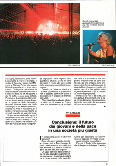 Dopo otto giorni passati a discutere di pace, aiuti al Terzo Mondo, disarmo, democrazia e futuro dei giovani altro non può essere, si concluderà, se non un futuro di pace.